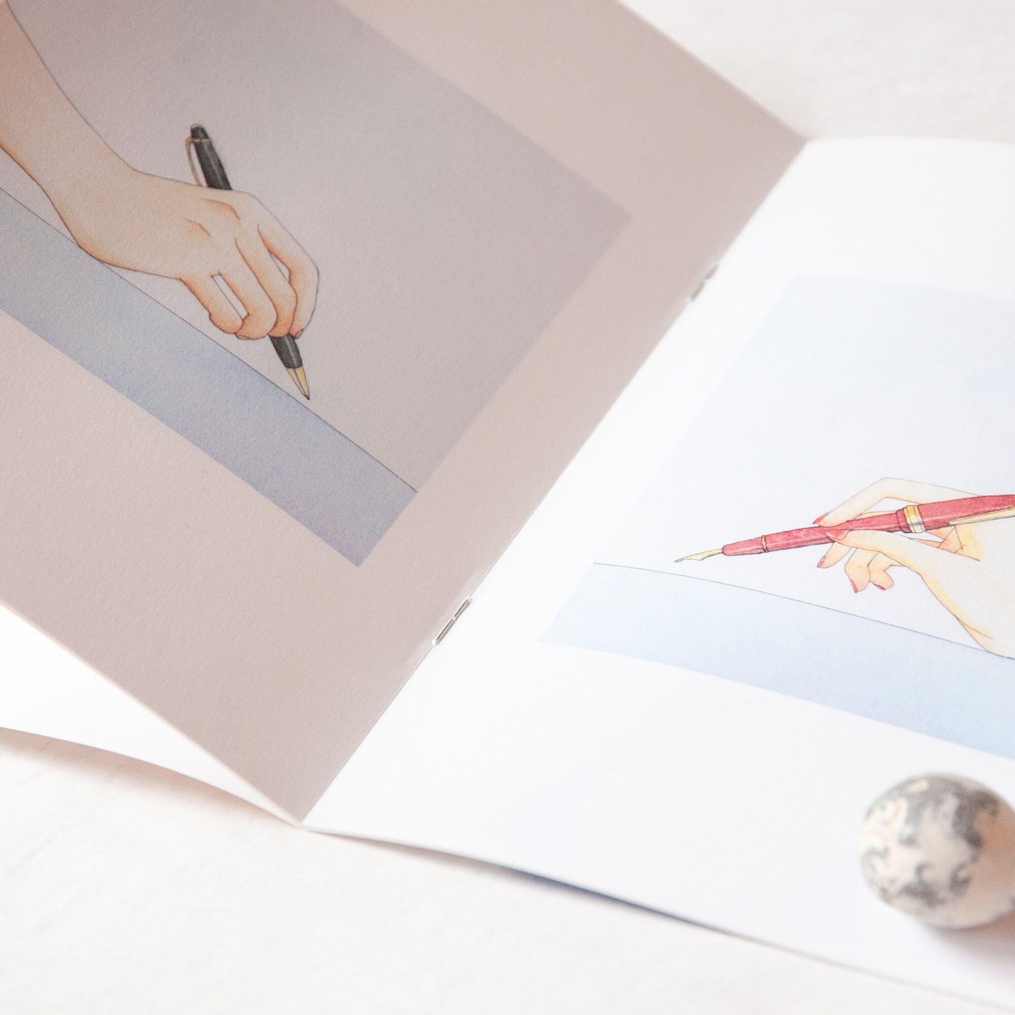 水彩紙のようなざらついた紙と、グロス感のある印刷のコントラストの綺麗な冊子となっています。また、表紙は開いた時に絵の繋がる仕様になっています。